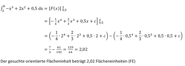 Berechne den orientierten Flächeninhalt der Fläche zwischen dem Graphen von und der x-Achse in den Grenzen 0,5 bis 2.