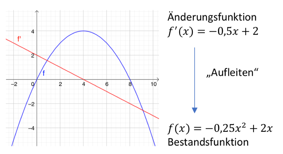 In den vorangegangenen Übungen hast du dir erarbeitet, wie man die Funktionsgleichung der Bestandsfunktion bestimmen kann. Ist also ein Funktionsterm y=f’(x) der Änderungsfunktion gegeben, so gelingt es in vielen Fällen die Bestandsfunktion zu rekonstruieren, indem man das Ableiten umkehrt. Man sucht also einen Term f(x), dessen Ableitung f’(x) ergibt.