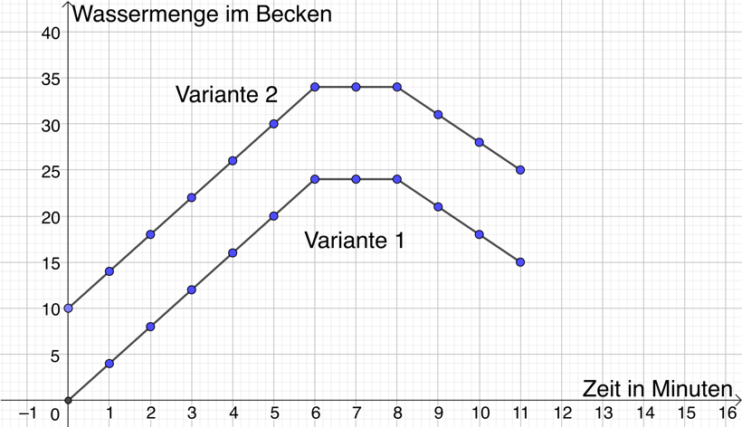 Für Variante 2 ist das Becken nach 6 Minuten mit 34 Litern Wasser gefüllt.
