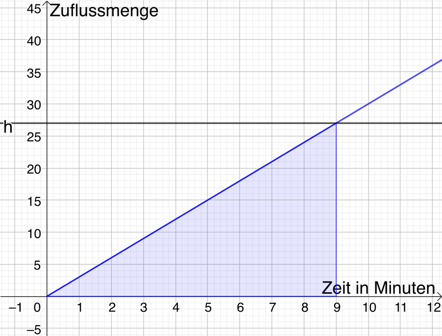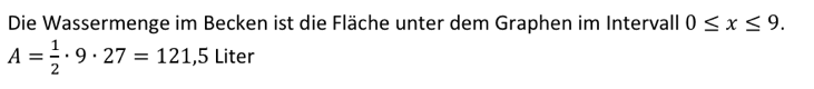 Der Flächeninhalt von Abbildung 1 bedeutet, die Menge an Wasser, die in den ersten 6 Minuten bei einer Zuflussgeschwindigkeit von 4 l/min in das Becken geflossen sind. In den 6 Minuten sind 24 Liter Wasser in Becken geflossen.